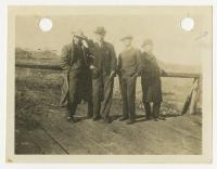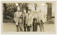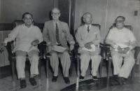 Photo of Deans Sinco, Malcolm, Bocobo, and Espiritu, 1955. Found in a brown booklet with the Manila Hotel Seal on front. All of the deans are seated together in a row in wooden armchairs, in a room with marble flooring and concrete walls. All are dressed in collared shirts or suits. The text in the brown booklet notes that the photo was a gift to George Arthur Malcolm from the faculty of the College of Law.