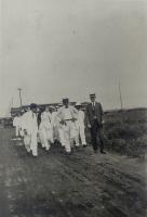 Photo of Malcolm marching from the dock with law students, headed towards the University hall. Malcolm is walking out front in a dark suit and brimmed hat, while the students walk along the dirt road behind him in their white suits and brimmed hats. In the background can be seen some buildings and an automobile.