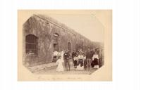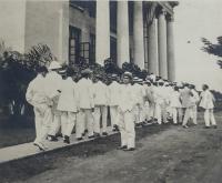 Photo of College of Law students going into the University hall. The students are wearing white suits and brimmed hats as before, and most march in a line along the sidewalk towards the University hall, the entryway of which is dominated by large pillars. A dirt road runs alongside the University hall. One student faces the camera.